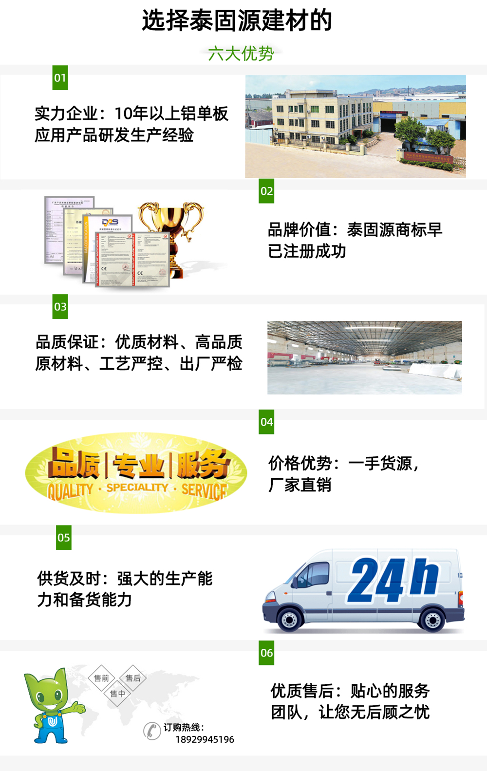 關于我們佛山市泰固源裝飾材料有限公司是一家研發、生產鋁單板和陶土板、航空板三大系列的大型企業。公司成立于二零一零年,鋁單板占地面積10000平米,陶土板占地面積300畝。擁有環境優雅、寬敞、明亮的現代化標準廠房及辦公大樓。位于佛山市南海區里水勝利工業園,地理位置優越。我司技術實力強大,生產管理科學嚴謹。它在引進意大利生產設備的基礎上,立足于持續革新制造工藝,使各項技術指標遠遠超出國家及行業標準,跨入先進水平行列,在經濟和社會效益方面取得了巨大的成就。我司自主研發、生產泰固源鋁單板,泰固源陶土板這兩大系列產品,多年來,經過公司全體員工的通力協作,我們的品牌產品(泰固源,辛源牌)得到業內人士一致認可。銷售網點遍布國內,并與諸多國內外客戶建立了長期友好的合作關系,產品銷往國內并走向世界
